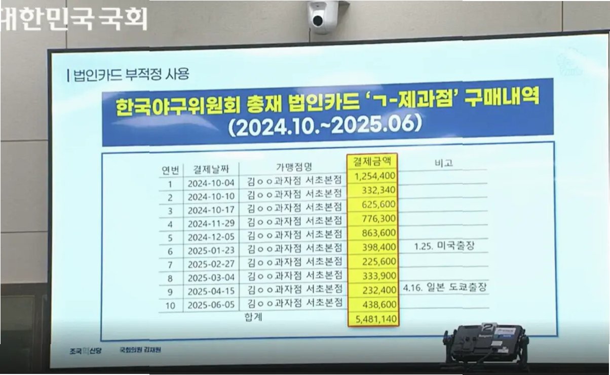 A.국회 김재원 의원을 통해 KBO 내부 자료가 공개되면서 법인카드 사용 내역이 드러났습니다.