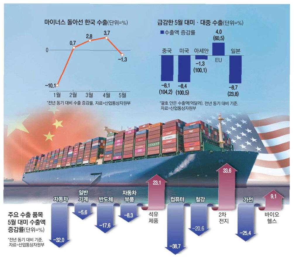 A.미국의 관세 부과로 인한 자동차, 철강 수출의 감소, 특정 품목(반도체)에 대한 높은 의존도 심화, 특정 국가(미국)에 대한 수출 의존도 등입니다.
