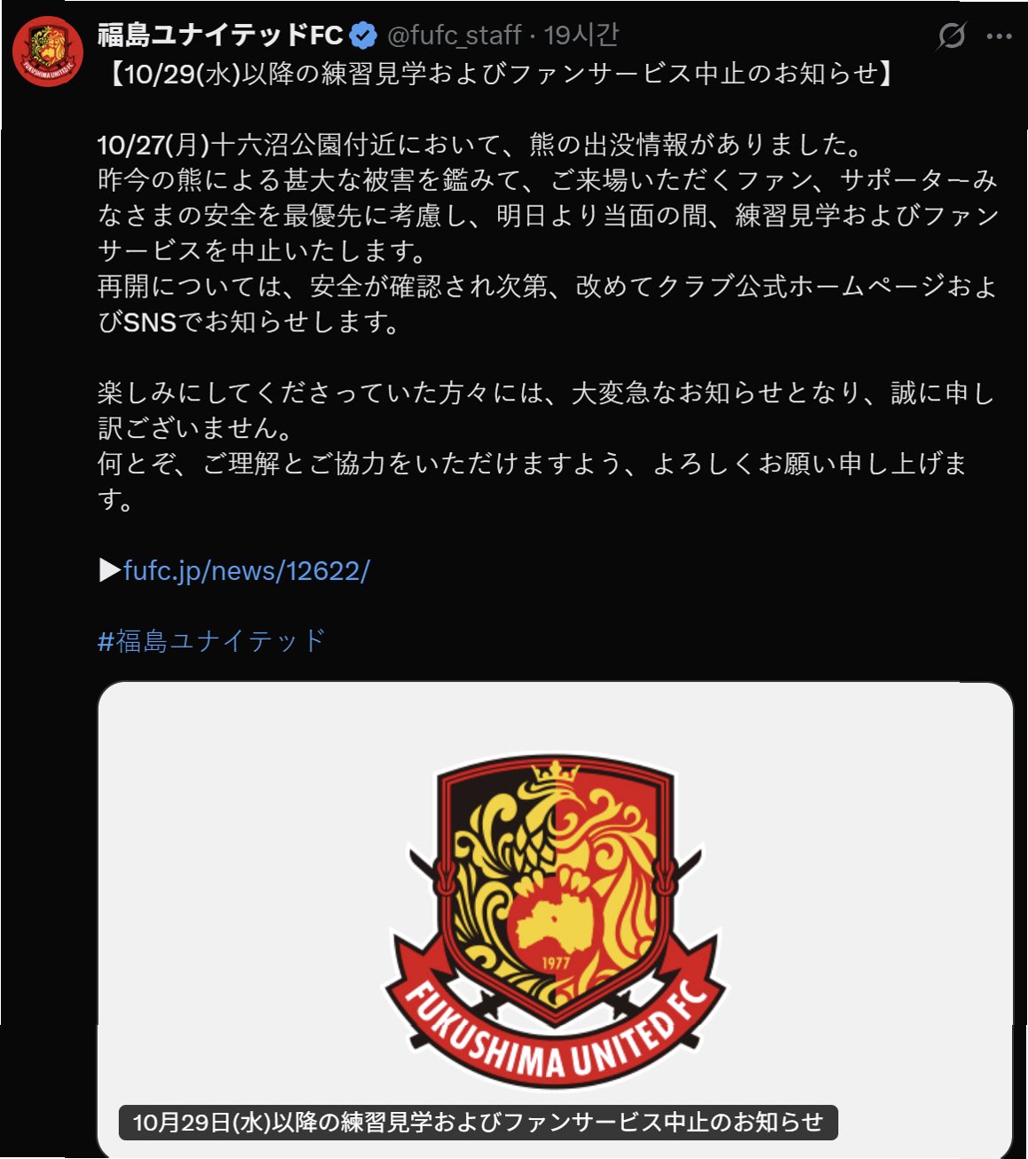 알비렉스 니기타에 앞서 J3 구단인 후쿠시마 유나이티드도 곰 출몰 제보로 인해 팀 공개 훈련을 잠정 중단했습니다. 후쿠시마 유나이티드는 주로쿠노마 공원 인근에서 곰이 출몰했다는 정보를 입수했습니다. 알비렉스 니기타는 후쿠시마 유나이티드의 사례를 참고하여 곰의 정확한 동선을 파악하기 어렵다는 판단하에 1군 팀 공개 훈련을 비공개로 전환했습니다. 이러한 결정은 선수와 팬들의 안전을 최우선으로 고려한 조치로 풀이됩니다.