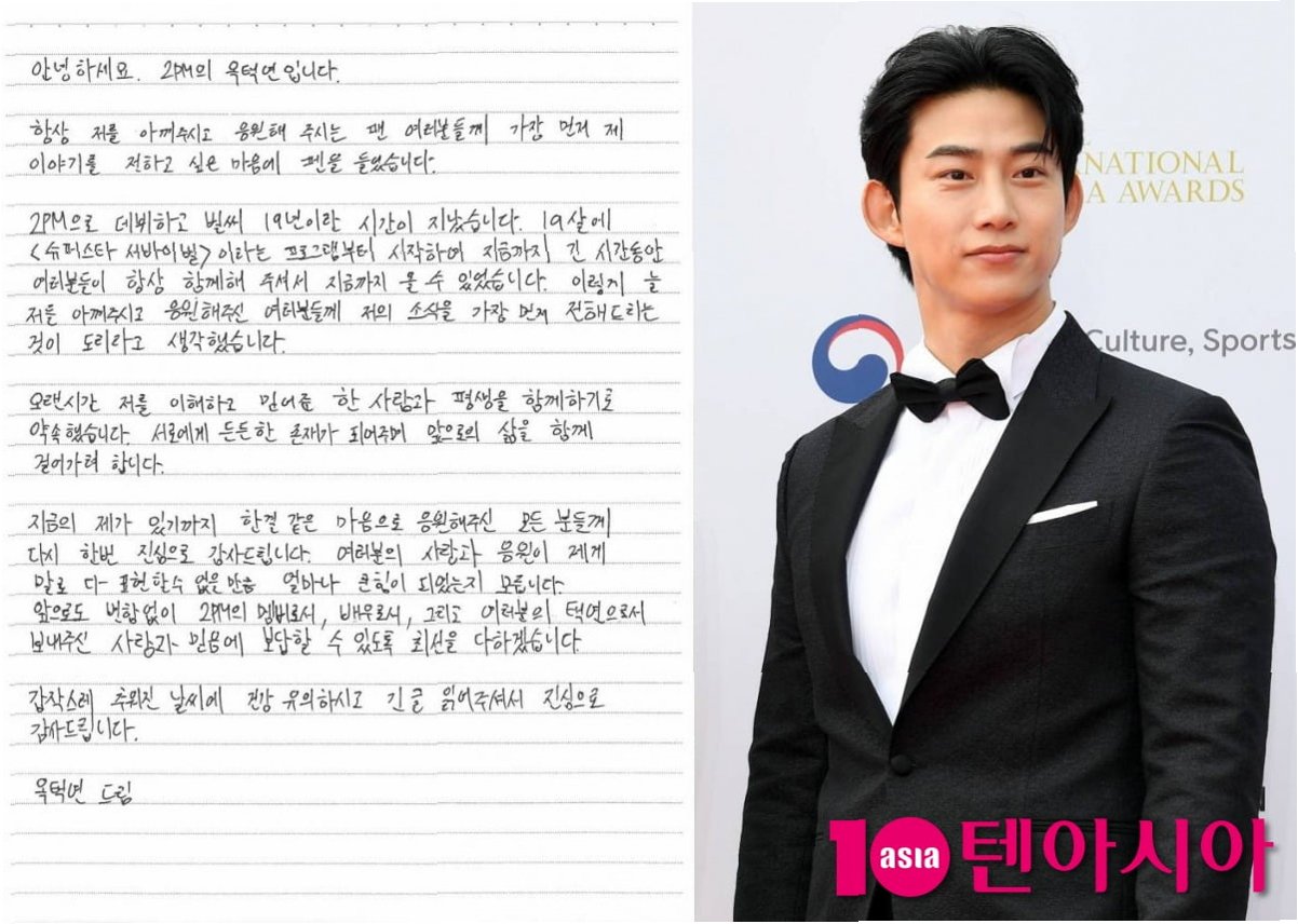 옥택연은 자필 편지를 통해 2PM으로 데뷔하여 19년이라는 긴 시간 동안 팬들과 함께해온 소회를 밝혔습니다. 그는 19살에 시작한 '슈퍼스타 서바이벌'부터 지금까지 팬들의 끊임없는 응원과 사랑 덕분에 이 자리에 설 수 있었다고 말했습니다. 옥택연은 오랜 시간 자신을 이해하고 믿어준 한 사람과 평생을 함께하기로 약속하며, 서로에게 든든한 존재가 되어 앞으로의 삶을 함께 걸어가겠다고 밝혔습니다.