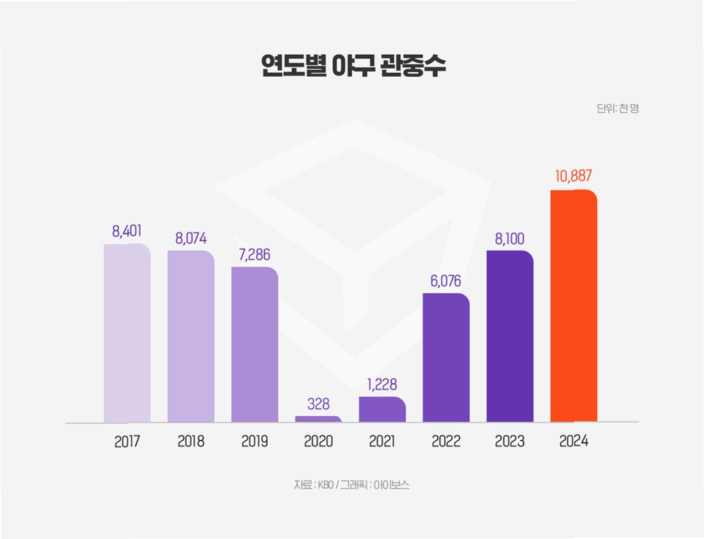 2022년 600만 관중을 넘어선 프로야구는 2023년 810만 명을 돌파하며 폭발적인 성장을 보였습니다. 특히 2030세대의 유입이 두드러졌습니다. 2024년에는 1000만 관중 시대를 열며, 구단 매출 또한 사상 최고치를 경신했습니다KIA 타이거즈는 상품 매출만으로 400억 원 이상을 벌어들였고, 김도영 선수의 유니폼은 100억 원 이상 판매되었습니다. 이는 프로야구의 위상이 얼마나 달라졌는지를 보여주는 단적인 예입니다.
