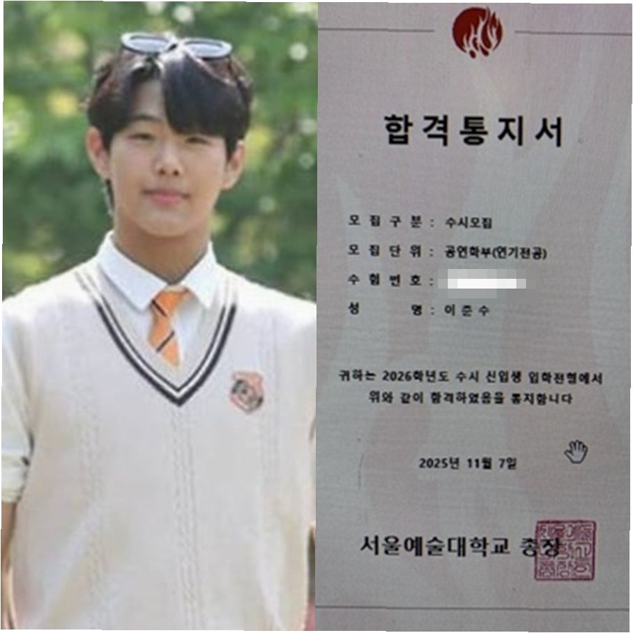 이준수가 서울예술대학교 최종 합격 소식을 알리며 배우로서의 꿈을 향한 힘찬 발걸음을 내디뎠습니다. 아버지의 뒤를 이어 연기자의 길을 걷게 될 이준수의 활약에 많은 기대가 모아지고 있으며, 그의 성장과 도전을 응원합니다.