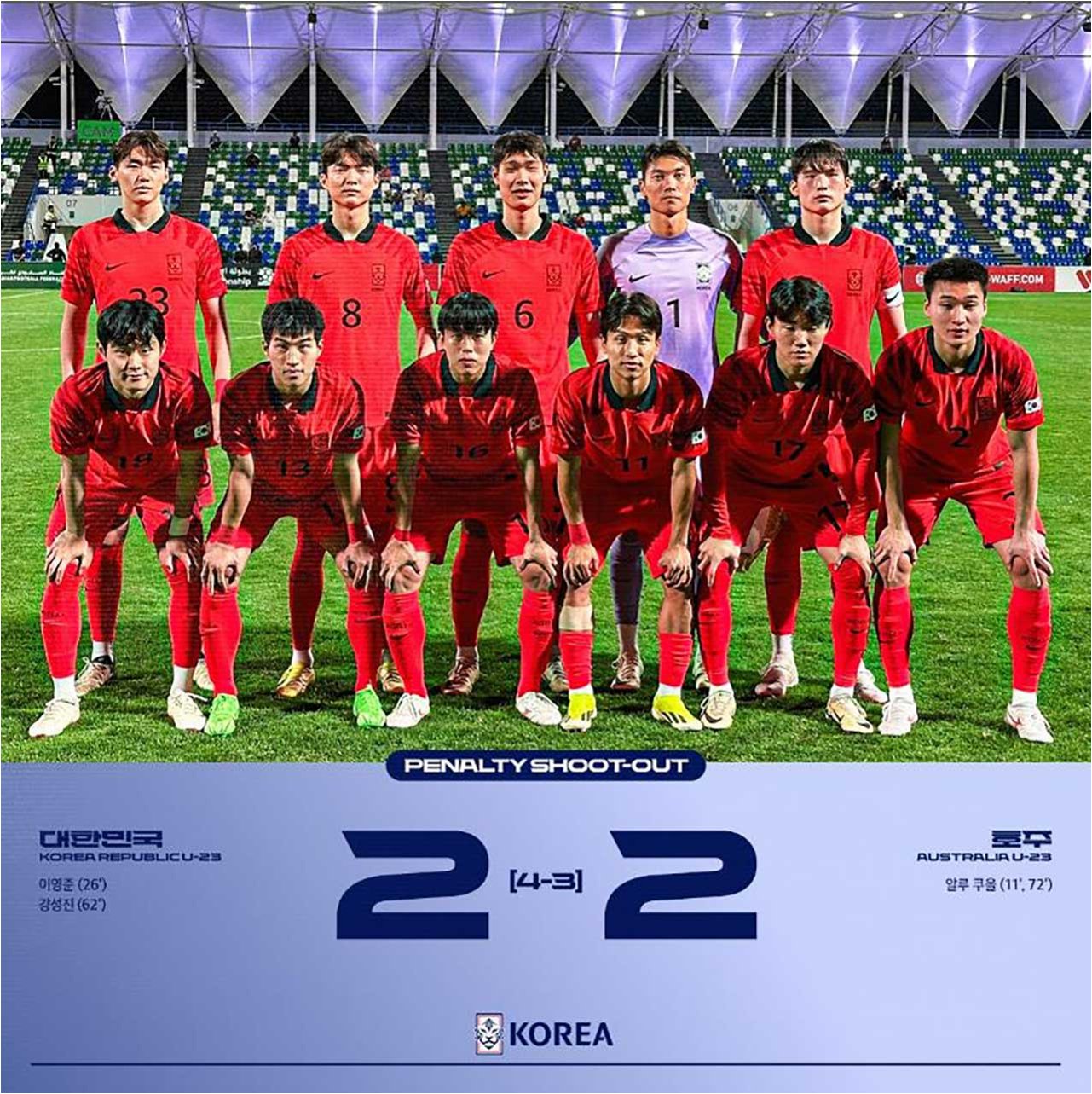 이날 경기에서 한국은 문현호 선수를 골키퍼로, 장석환, 신민하, 박준서 선수를 백3로 기용하며 안정적인 수비를 구축했습니다. 중원에는 김도현, 김한서, 강성진, 김동진, 이건희 선수가 배치되어 공수 밸런스를 유지했고, 최전방 투톱에는 정재상, 정승배 선수가 출전하여 공격을 이끌었습니다. 후반전 교체 투입된 김명준 선수의 활약 역시 승리에 결정적인 역할을 했습니다. 이민성 감독의 전략적인 지휘와 선수들의 뛰어난 집중력이 완승을 이끌었습니다.