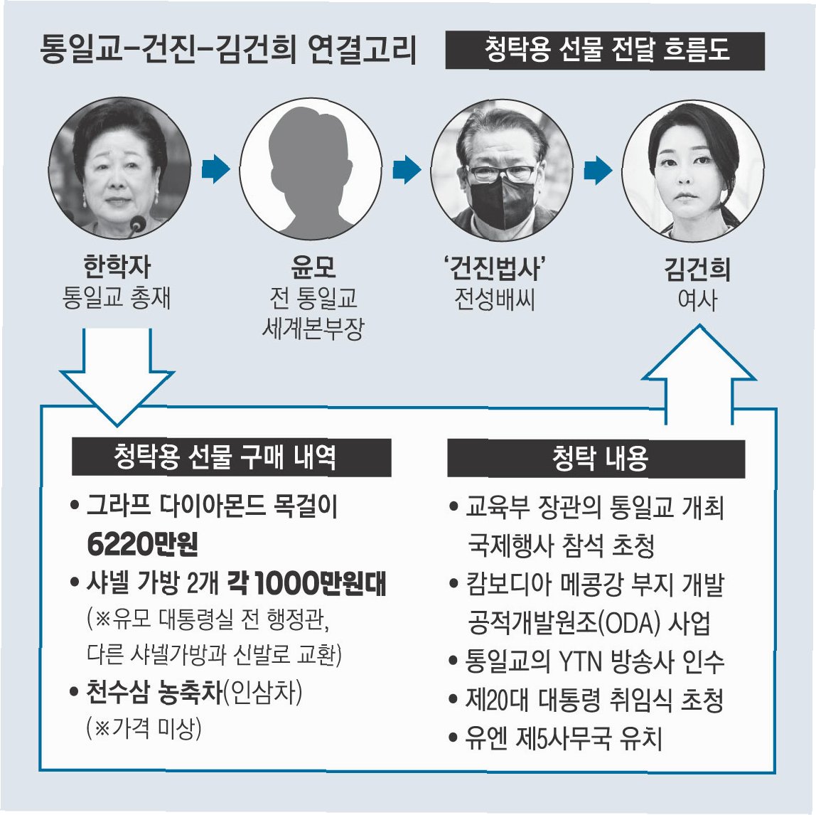 건진법사는 재판에서 김건희 여사가 통일교 선물에 대한 검찰 수사가 시작된 후, '부정 청탁을 받은 사람은 죄가 되지 않고 전달한 사람만 죄가 된다'며 전달하지 않은 것으로 하자고 했다고 증언했습니다. 이는 김건희 여사가 자신의 측근들을 보호하기 위해 거짓 진술을 종용했음을 시사하는 중요한 대목입니다. 건진법사는 유경옥 전 행정관에게 가방 교환 심부름을 시켰다고 진술했으나, 실제 지시는 김 여사로부터 내려졌습니다.