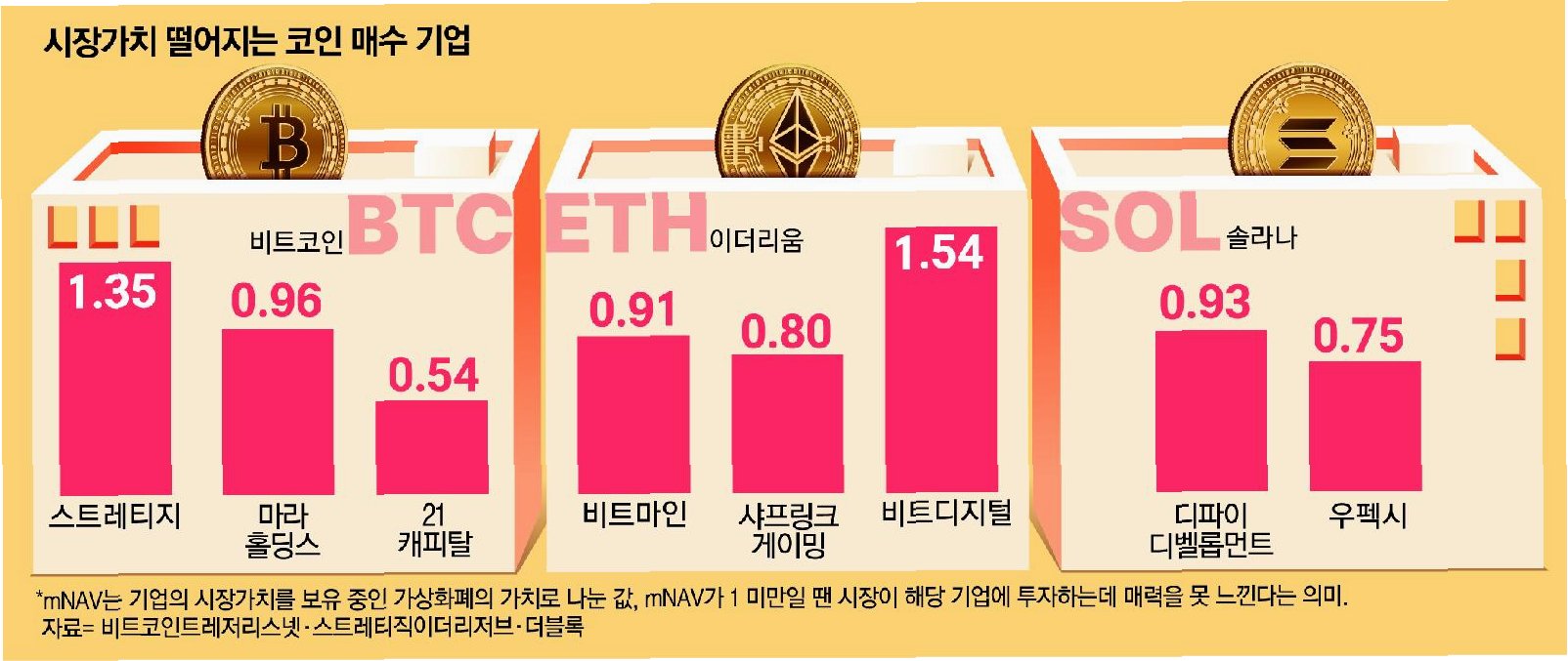전환사채(CB) 발행 등으로 자금을 조달해 가상자산을 매입하던 비축 기업(DAT)들이 무너지고 있습니다. 기업 시가총액이 보유하고 있는 가상자산 가치 아래로 떨어지면서 추가 자금 조달에도 빨간불이 켜졌습니다. DAT들이 향후 가상자산 시장에도 악영향을 줄 수 있다는 우려도 커지고 있습니다.