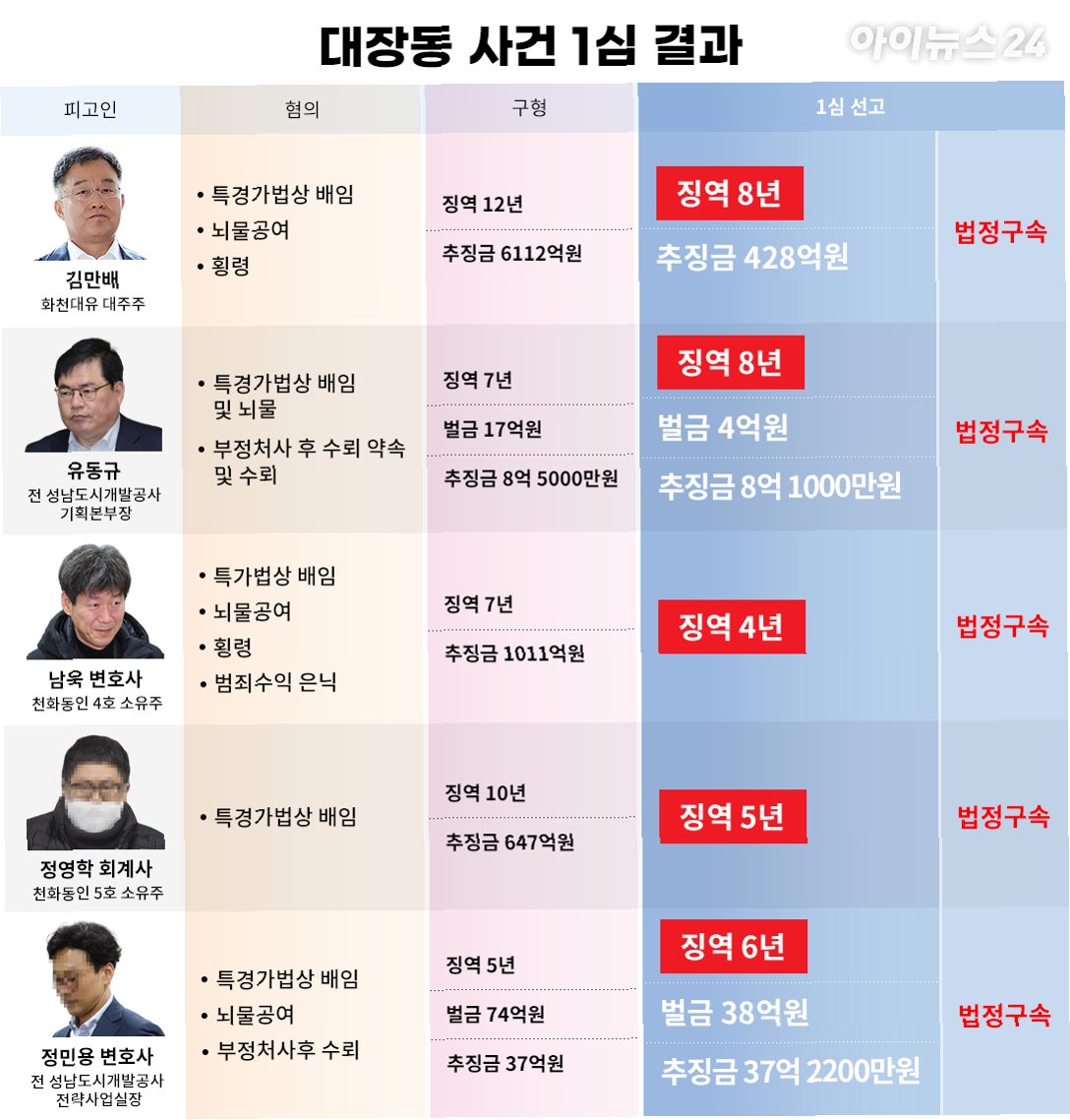 유 전 본부장에게는 징역 8년과 벌금 4억원, 추징 8억1천만원이 선고됐다. 화천대유자산관리 대주주 김만배 씨는 징역 8년과 428억원 추징이 내려졌다. 남욱 변호사와 정영학 회계사는 징역 4년과 징역 5년을 각각 받았다. 공사 전략사업실 투자사업팀장으로 일한 정민용 변호사는 징역 6년과 벌금 38억원, 추징금 37억2천200만원이 선고됐다.