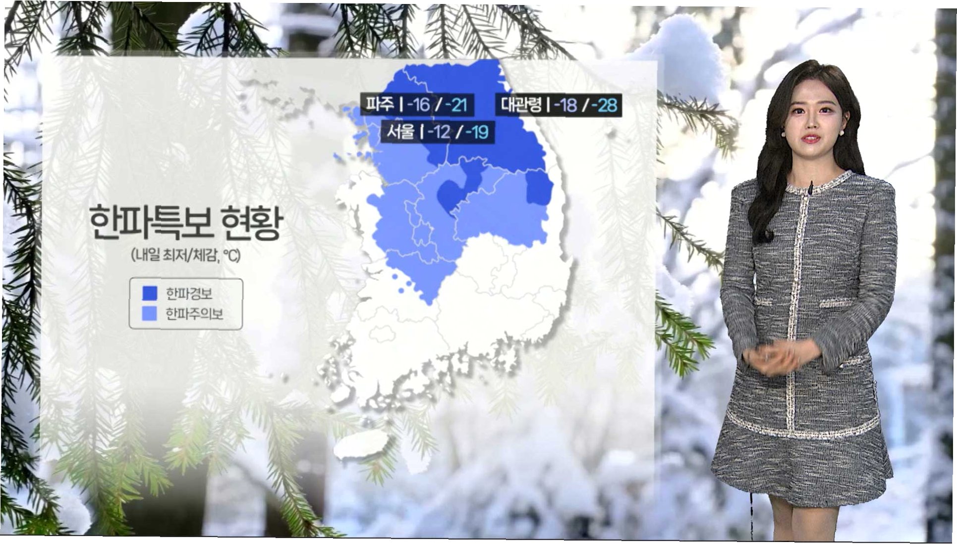 A.서울, 경기, 인천, 충청, 전북, 경상 서부 지역에 한파주의보가 발령되었습니다.