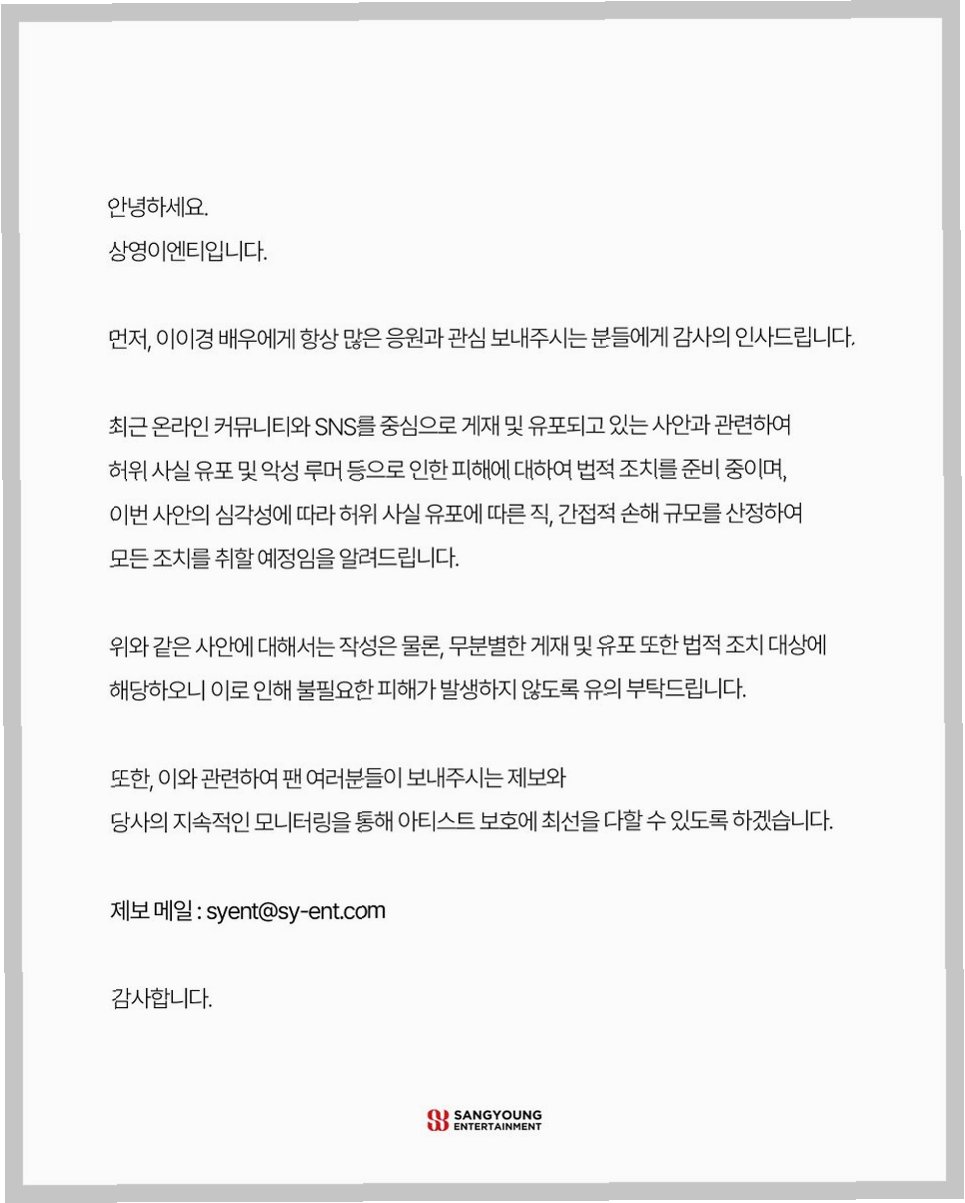 상영이엔티는 공식 입장을 통해 이번 사건에 대한 입장을 밝혔습니다. 소속사는 허위 사실 유포에 대한 깊은 유감을 표명하고, 법적 대응을 통해 배우의 명예를 지키겠다는 의지를 강조했습니다. 또한, 합의나 보상에 대한 논의는 없을 것이라고 밝히며, 강력한 대응을 예고했습니다. 소속사는 지속적인 모니터링을 통해 악성 게시글 작성에 대해서도 엄중하게 대처할 것을 밝혔습니다.