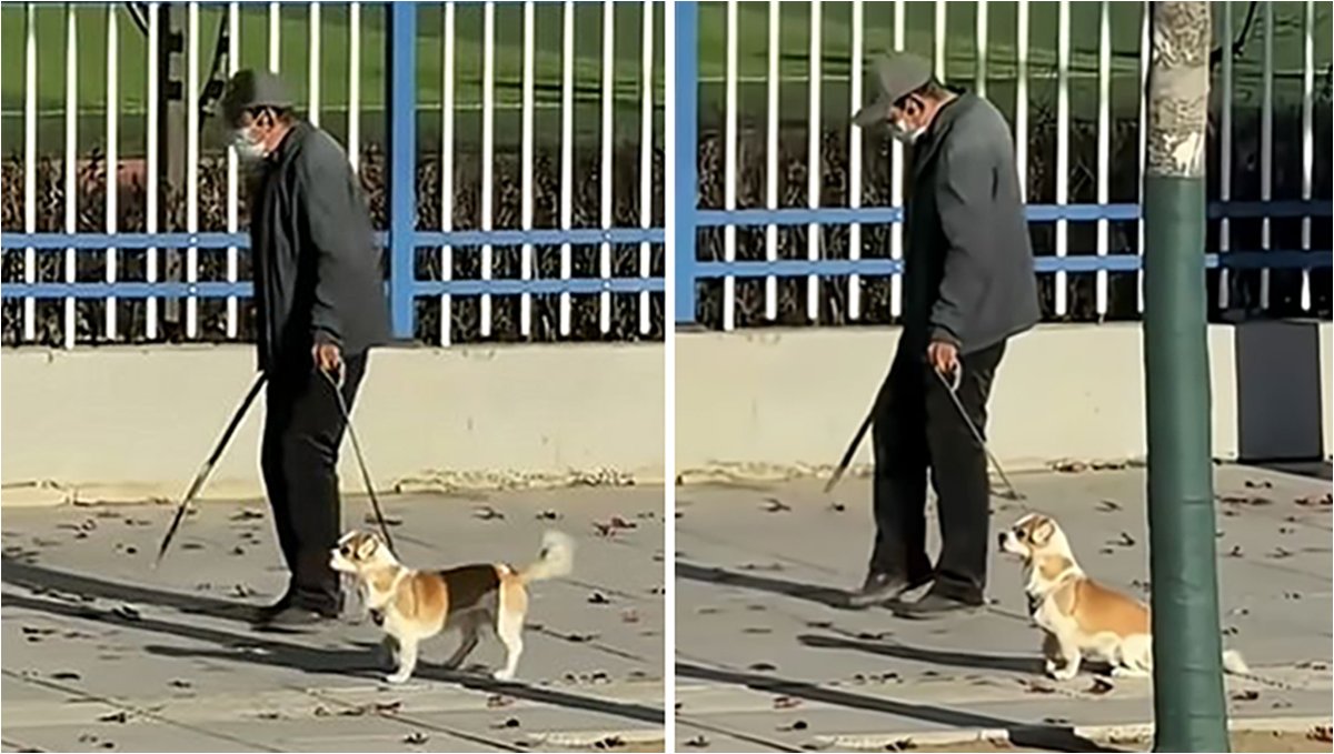노인의 느린 걸음에 맞춰 앉았다 일어났다… 강아지의 뭉클한 배려심